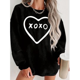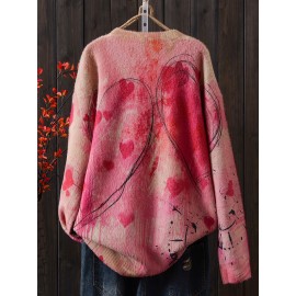 Plus Size Casual Top, Women's Plus Rugby & Heart Print Long Sleeve Round Neck Medium Stretch Top